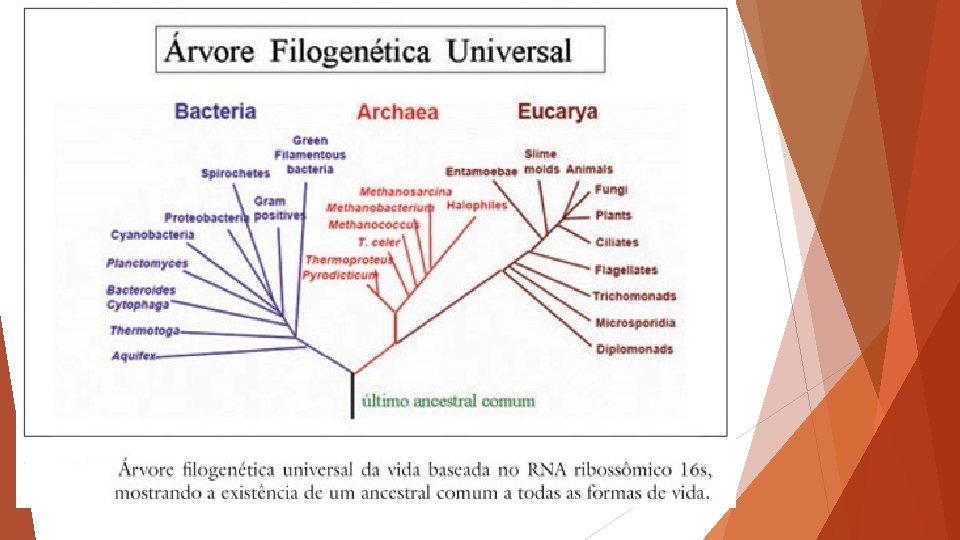 A partir dos estudos de C. Woese e G. Fox (1977) Os 3 Domínios Archaea: Procariotos Bacteria: Procariotos Eukarya: Eucariotos Sistema de classificação baseado principalmente em aspectos evolutivos (filogenética), a partir da comparação das sequências de r. RNA de diferentes organismos. Com esta nova proposta de classificação, os organismos seriam subdividos em 3 domínios (contendo os 5 reinos), empregando-se dados associados ao caráter evolutivo.