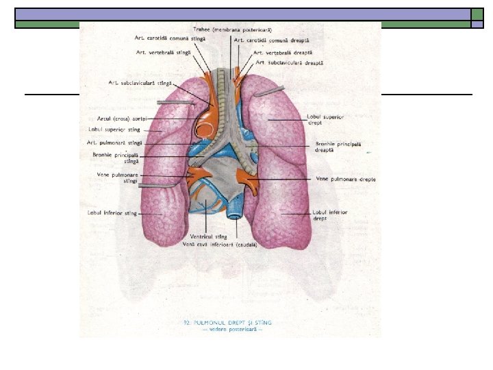 Parenchimul pulmonar o o o Plămânii au o structură segmentară, fiind alcătuiţi din: n lobi pulmonari (2 plămânul stâng, 3 plămânul drept) n segmente pulmonare (câte 10 segmente pentru fiecare lob) n lobuli pulmonari. Lobulul pulmonar reprezinta unitatea morfologica si functionala a plamanului, la nivelul caruia se face schimbul de gaze. Lobulul pulmonar este constituit din: bronhiola respiratorie + canale alveolare + alveole pulmonare + vase de sange şi limfatice + fibre motorii nervoase si senzitive. Alveola pulmonara - peretele alveolar este format dintr-un epiteliu, sub care se gaseste o bogata retea capilara, care provine din ramificatiile arterei pulmonare (ce aduc sange venos din ventriculul drept).