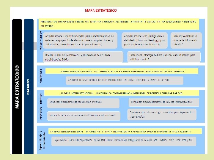 Marco institucional de la Secretaría de la Función Pública Promoción y consolidación de espacios donde es necesario que el Estado se encuentre disponible y efectivo para responder con enfoque de derechos a las condiciones en que se encuentran diversos colectivos. Consolidación de la institucionalidad del Sistema proveyendo respuestas y planes que aseguren condiciones de equidad e igualdad de oportunidades. Establecer varias líneas de acción, entre las cuales se encuentran las vinculadas al eje de inclusión laboral, más específicamente en lo que hace a hacer efectivas leyes antes mencionadas.