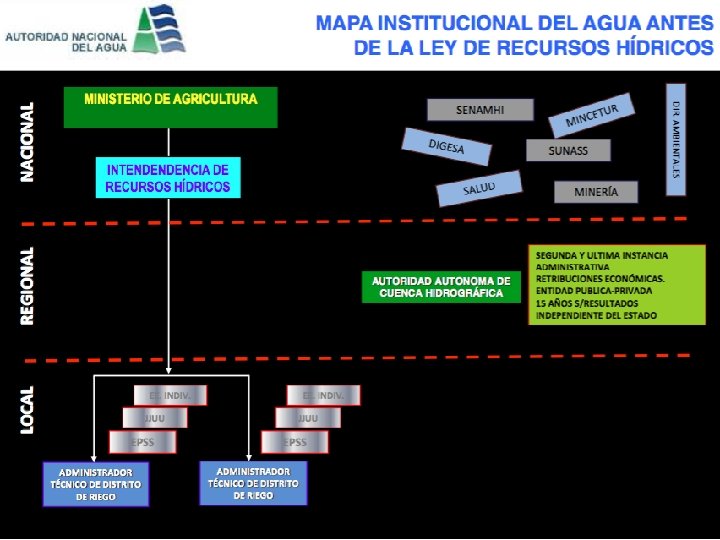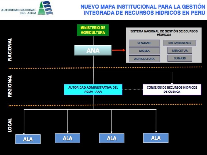 Autoridad Nacional del Agua - ANA Visión de la Gestión de los Recursos Hídricos Gestión Integrada de los Recursos Hídricos (RRHH) orientada al uso sostenible, la asignación y control del uso de los RRHH en el contexto de objetivos sociales, ambientales y económicos. No es un enfoque sectorial como en la anterior Ley de Aguas.