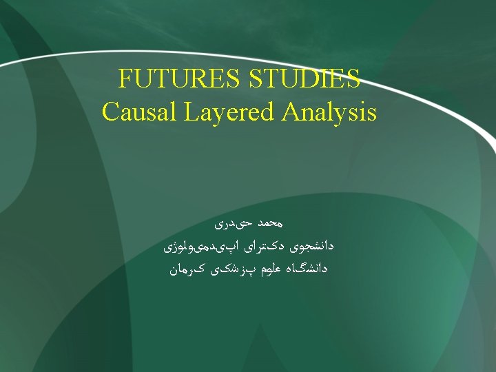Causal Layered Analysis Social causes Newspaper headlines, superficial, common public perceptions Public Superficial Litany STEEP analysis Cultural/social/religious perspective or worldview Myth Emotional, images or deep meanings Unconscious Deep Meaning Worldview