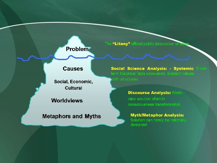 • Litany: - visible - disconnected news events • Systemic: - social, technological, economic, environmental and political causes • Discourses: - stakeholders - ideologies - worldviews • Myths-metaphors: - stories - legends - myths of trauma and transcendence