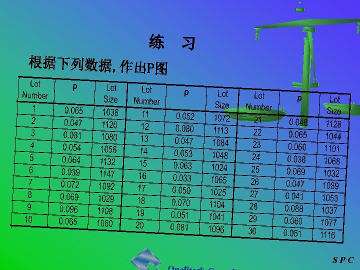 典型的 P 图 (UCL) (LCL) 日期 5/11 6/11 检验样 本数 7/11 968 1216 8/11 804 9/11 1401 10/11 1376 995 不合格 数 不合格 率 8 13 13 16 14 0. 008 15 0. 011 0. 016 0. 011 0. 015 0. 011 SPC