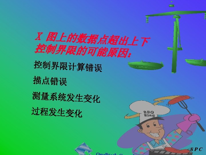 X 图 Upper Control Limit (UCL) Center Line (CL) Lower Control Limit (LCL) 连续七点在控制中限的 下方 SPC