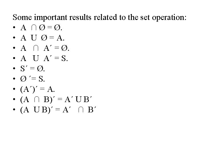 • Example 5: (set operations) let S= {0, 1, 2, …, 7}, A= {0, 2, 6}, B= {1, 2} and C= {0, 6}. Find A ∩ B, A U B, B ∩ C, Aˋ. • A ∩ B = {2} • A U B = {0, 1, 2, 6} • B ∩ C= Ø • Aˋ= {1, 3, 4, 5, 7}