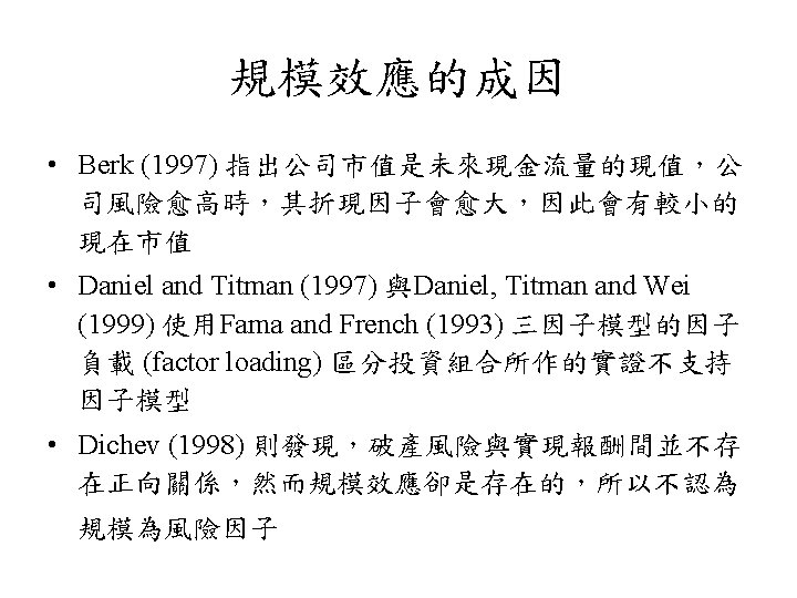 規模效應 • 規模效應與季節間存在關聯性,如Keim (1983) 發現規模 效應多集中在元月份,Bhardwaj and Brooks (1993)、 Ibbotson and Sinquefeld (1995) 及Kim and Burnie (2002) 發 現景氣與市場多空等因素會左右規模效應的結果 • 美國的實證如Bhardwaj and Brooks (1992)、Fama and French (1992,表六)、Siegel (1994, Ch. 5)、Jagannathan and Mc. Grattan (1995)、Hawawini and Keim (1995) 、Dichev (1998) 及Horowitz, Loughran and Savin (2000) 則發現以 1980年代為分水嶺,在此之後規模效應不復明顯