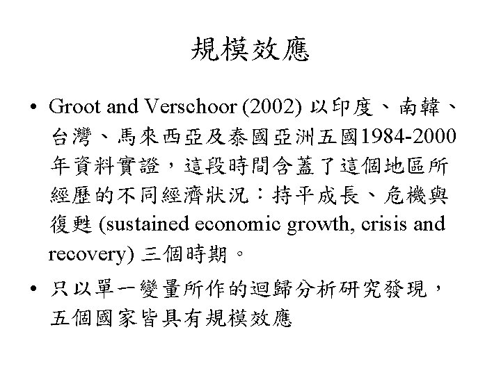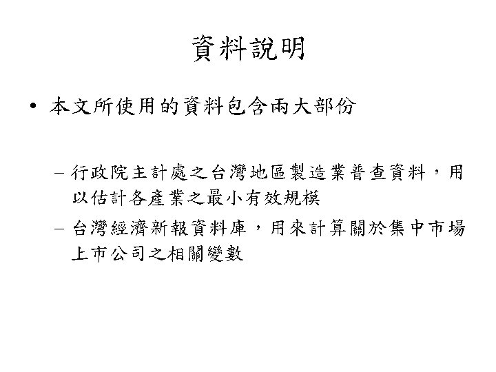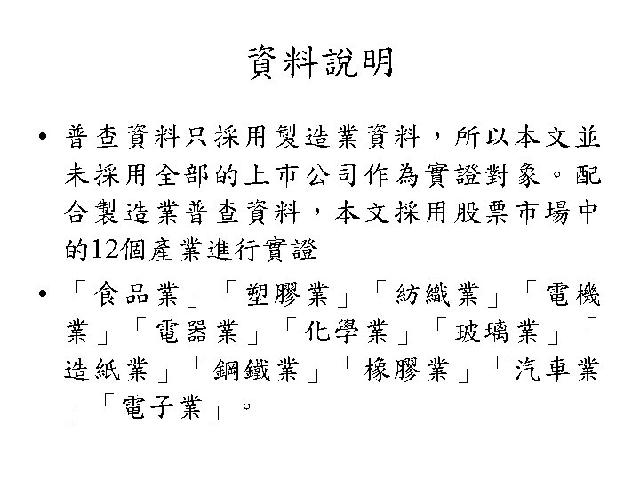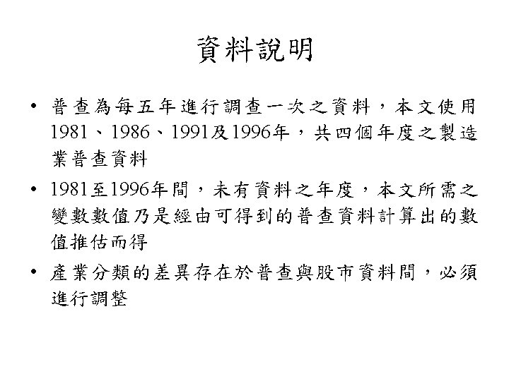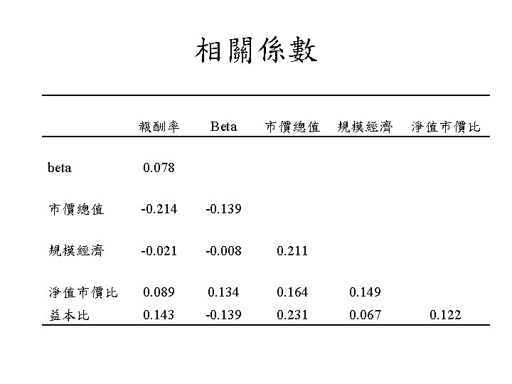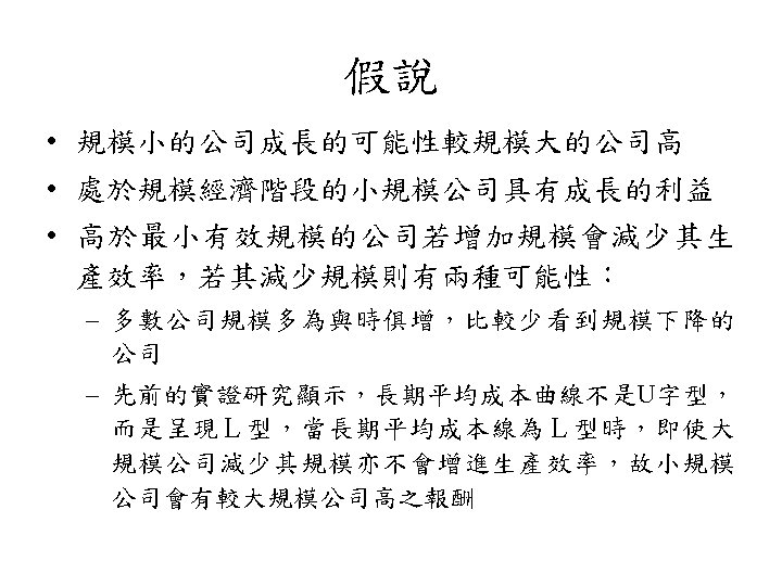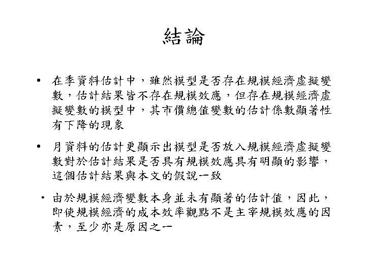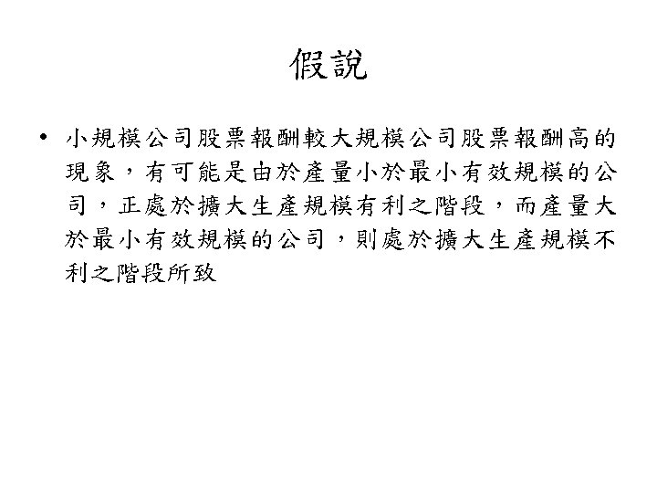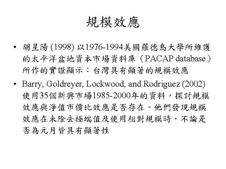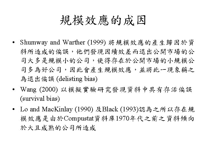 規模效應 • 公司規模與股票報酬存在負向關係之現象,學者 稱之為規模效應 (size effect) • 美國: Banz (1981)、Reinganum (1981, 1983)、 Keim (1983) 及Fama and French (1992) • 日本與澳洲: Kato and Schallheim (1985) 及Brown, Kleidon and Marsh (1983)