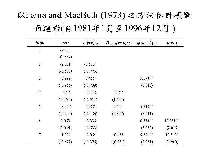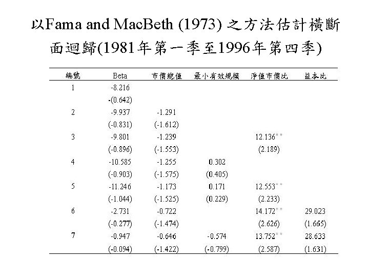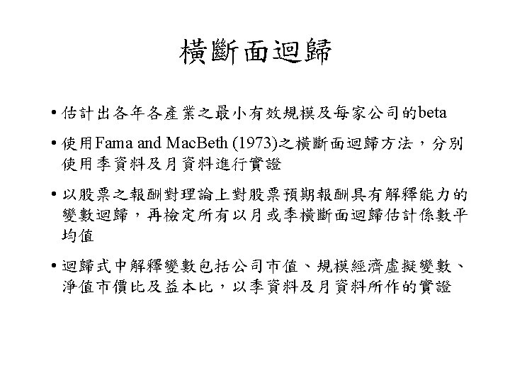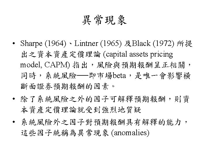 規模效應的成因 • 規模效應是由小公司股票交易較不頻繁 (infrequent trading) 所引起 (Banz, 1981; Lustig and Leinbach , 1983) • P/E差異 (Cook and Rozeff, 1984) • 交易成本 (Stoll and Whaley, 1983) • 稅損賣出 (tax-loss selling) (Reinganum, 1983) • 訊息效果 ( information effect) (Barry and Brown, 1984)