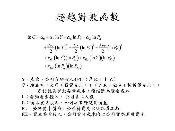超越對數函數 • Christensen, Jorgenson and Lau (1971, 1973) 所 提 出 之 超 越 對 數 函 數 (transcendental logarithmic function)