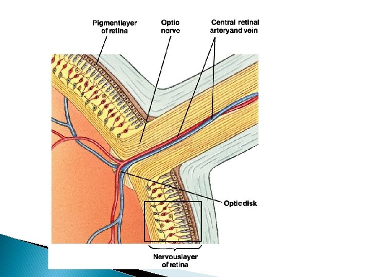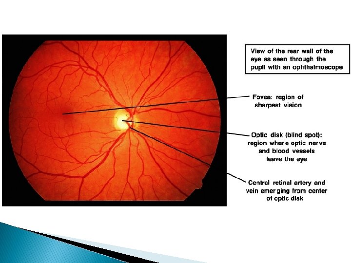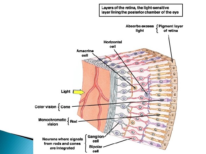 Ljósfræði augans � Ljósið verður að falla á sjónhimnuna (retina) sem er þunnt lag taugavefs aftast í augnkúlunni. � Í sjónhimnunni liggja ljósviðtakarnir, stafir og keilur, ásamt nokkrum öðrum tegundum taugafruma.