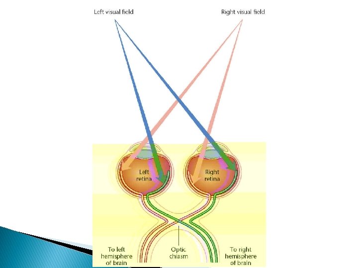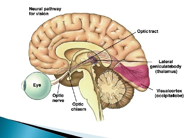 Sjóntaugafrumur � Mynda boðspennur. � Safnast saman í sjóntaugina (optic nerve). � Sjóntaugarnar hittast við botn heilans og mynda optic chiasm. ◦ Þar skipta þær sér og tryggja að bæði heilahvel fá upplýsingar frá báðum augum. � Lateral geniculate nucleus. � Þaðan yfir á sjónbörk.