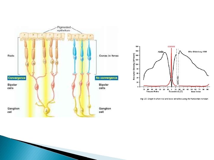 Ljósviðtakar (photoreceptors) � Lögun ljósviðtakana veldur því að þeir eru kallaðir stafir (rods) og keilur (cones). � Augað er þannig byggt að ljósnæmi hluti viðtakana snýr frá ljósinu sem fellur á sjónhimnuna. � Stafirnir er ótrúlega næmir og svara í lítilli birtu. Keilurnar eru ekki eins næmar, en þær geta greint liti.