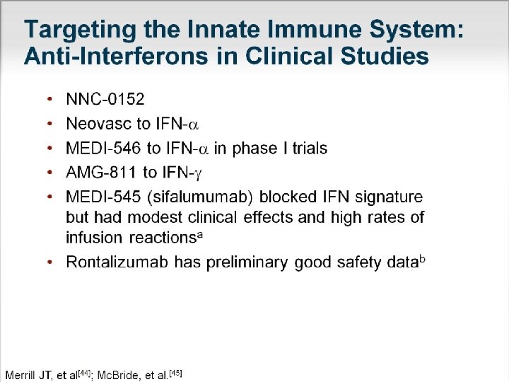Other Inhibitors of IFN a. Initial trials of anti-type 1 IFN had infusion reactions and only modest efficacy b. Medi 546 (type 1 IFN-R antagonists) now in phase 1 (scleroderma) and juvenile SLE phase 2 trial