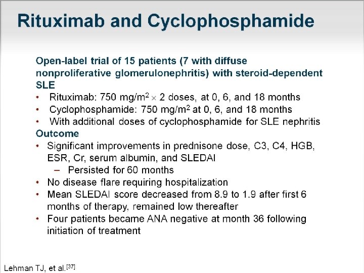 Therapy for Extraglandular Manifestations • Lupus-like vasculitis (immune complex) • Aggressive lymphocytes (interstitial pneumonitis, nephritis, lymphoma) • Responds to rituximab or cyclophosphamide • This is area where usually can show benefit with rituximab and otherapies