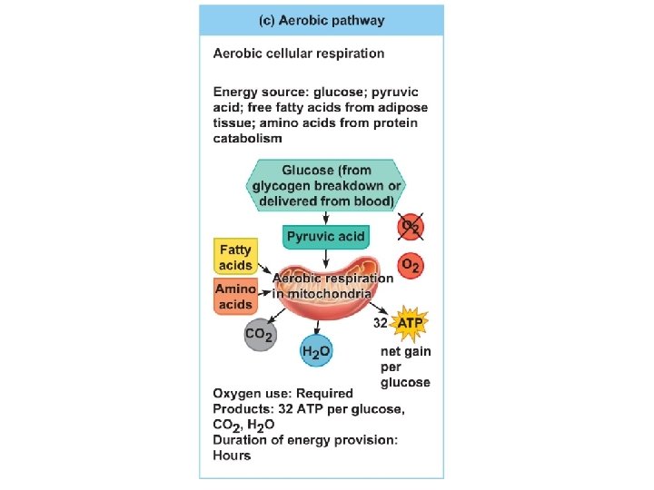 Energy for Muscle Contraction • Aerobic respiration – Uses O 2 to break down glucose (in mitochondria – Releases energy (about 32 ATP) – Slower reaction – CO 2 and H 2 O are produced