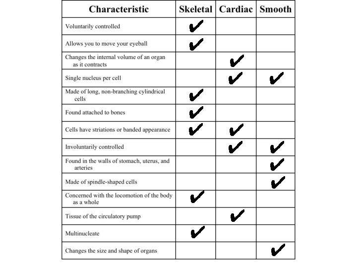 Cardiac Muscle Characteristics • • • Branching cells Joined at intercalated discs Found only in the walls of the heart Striated w/single nucleus Involuntary