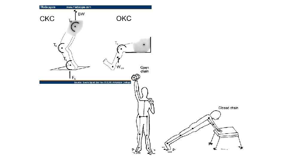 Open & Closed Kinematic Chains • Open Kinematic Chain • Sequence of action in which the body part farthest from the trunk is free during movement • i. e. Seated leg extension • Closed Kinematic Chain • Sequence of action in which the body part farthest from the trunk is fixed during movement • i. e. In a squat, feet are fixed and the rest of leg chain moves
