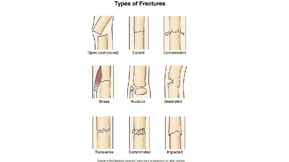 Skeletal Injuries—Fracture • Fractures (fx): break in bone • Failure point: amount of energy needed to cause a fracture • Simple (closed) • Compound (open) • Direct trauma • Fx directly at site where force applied • Indirect trauma • Fx occurs some distance where force applied • Sudden, violent muscle ctx or repetitive abnormal stress to bone