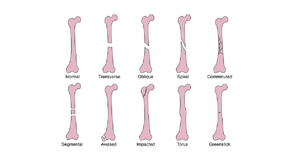Acute Bone Fractures • Depressed • Greenstick • Impacted • Longitudinal • Spiral • Oblique • Serrated • Transverse • Comminuted • Contrecoup • Blowout • Avulsion