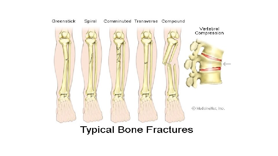 Fractures • Signs & Symptoms • • • Swelling (edema) Deformity Pain Tenderness Discoloration Loss of function • Treatment • Internal fixation • External fixation • Remodeling: process of absorbing and replacing bone