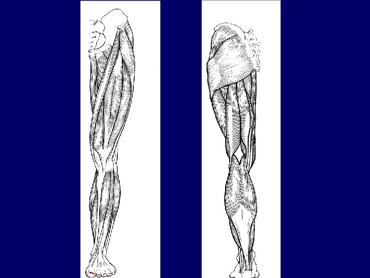 Muscles of the hip, thigh, and leg (cont. ) • Gastrocnemius – Two-bellied muscle of the posterior leg. – Originates on each side of the distal femur and insert by calcaneal tendon into the calcaneus. – Prime mover for plantar flexion of the foot. – Often called the “toe dancers” muscle.