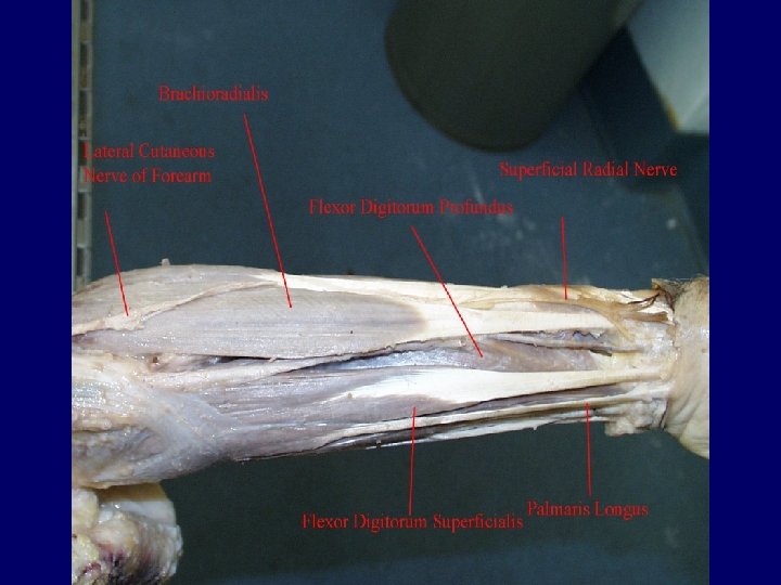 Muscles of the arm and forearm (cont. ) • Brachioradialis – Originates on the humerus and inserts into the distal forearm. – Assists in flexion at the elbow and also supinates/pronates the forearm.