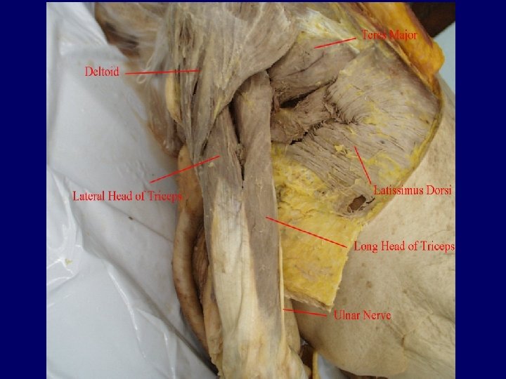 Posterior Thorax • Deltoid – Triangular shaped the forms the rounded shape of your shoulders. – Favorite injection site (less than 5 m. L). – Originates at the scapular spine and clavicle. – Inserts into the proximal humerus. – Prime mover of arm abduction.