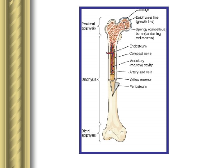 Bone Membranes l Contain bone-forming cells l Periosteum – covers bone -provides a layer of defense to protect the bone from infection - inner elastic layer is the area where new bone is formed -is permeated with nerves and blood vessels, which aid in nourishing the underlying bone -outer collagenous layer serves as an area of attachment that merges with those of the tendons and ligaments l Endosteum – line marrow cavity