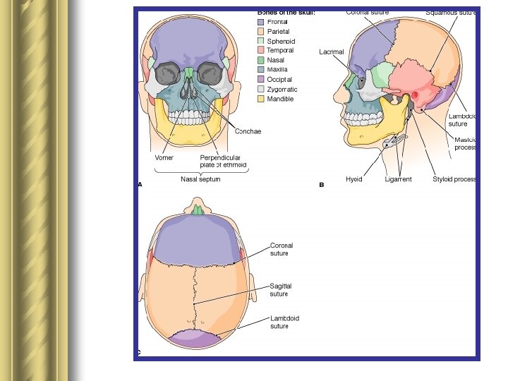 Framework of the Skull l Cranium l Facial Bones (8) l Ossicles of ear l Hyoid – Only bone in the body that does not articulate or connect to another bone l Infant skull – Fontanels (soft spots)fibrous connective tissue located between bones