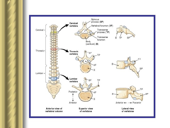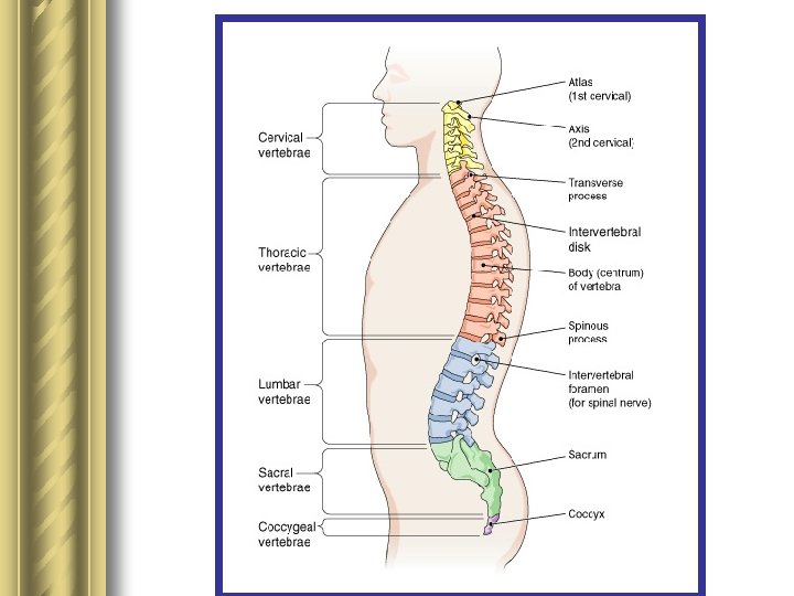 Framework of the Trunk l Vertebral Column- begins close to the foramen magnum of the skull and extends posteriorly to the pelvis. - Cervical – 7 (Convex) C 1 -C 7 - Thoracic – 12 (Concave)T 1 -T 12 - Lumbar – 5 (Convex)L 1 -L 5 - Sacral – 5 fused (Concave) - Coccygeal – 3 -4