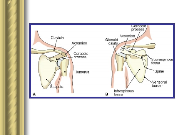 Joints l Joints are also called articulations l Fibrous – Synarthrosis -immovable l Cartilaginous – Amphiarthrosis slightly movable l Synovial - Diarthrosis – freely movable; have a potential space between the bones called the joint cavity; contains a small amount of thick, colorless fluid – synovial fluid