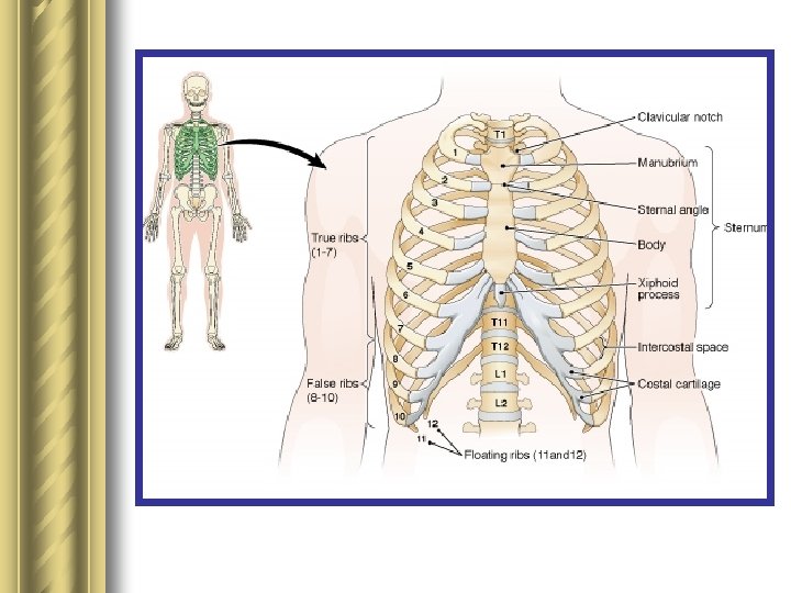 Framework of the Trunk continued: l Thorax Sternum – manubrium, body xiphoid process Ribs -True ribs – First seven pairs -False ribs – Remaining five pairs, of which two are floating pairs Intercostal spaces – spaces between ribs, which contains muscles, blood vessels, and nerves.