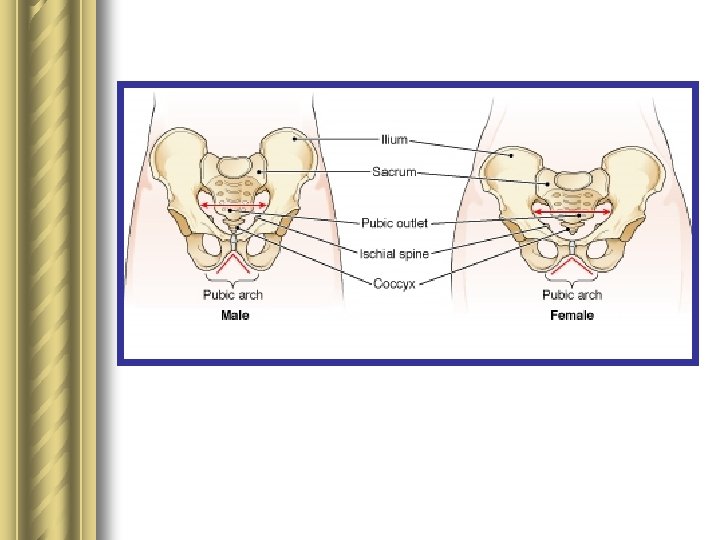 Bones of Lower Division l Pelvic Bones – os coxae (hip bone); ilium; ischium pubis Female pelvis differs from male l Lower extremity – femur; patella, tibia, fibula, tarsals, metatarsals, phalanges.