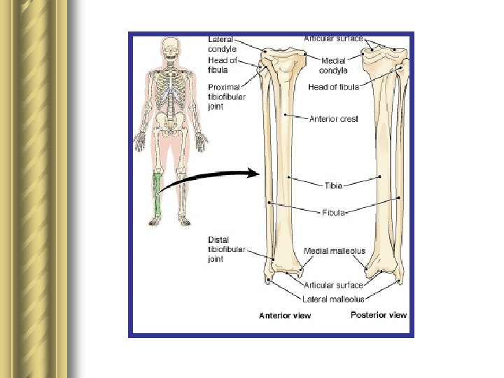 Lower Extremity Femur – longest and strongest bone in the body; large ball-shaped head that joins the hip bone. Large lateral projection near the head of the femur – greater trochanter (surface landmark) Smaller elevation located on the medial side – lesser trochanter Patella – sesamoid bone – develops within a tendon or joint capsule. Tibia - medial side (great toe side) shin bone and is the longer weight bearing bone. Fibula – lateral; is not weight bearing Tarsals- 7; largest is the calcaneus or heel bone Metatarsals – 5; framework of the instep