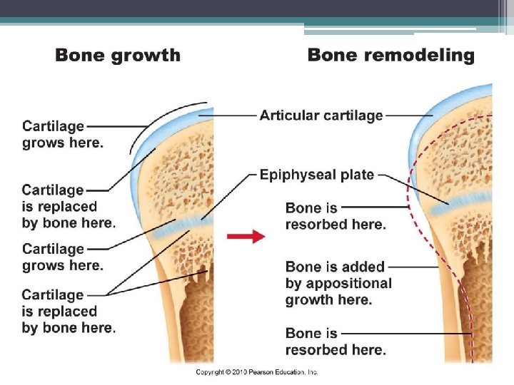 Hormonal Control • Growth hormones: hormones stimulate longitudinal bone growth • Thyroid hormone: hormone control activity of growth hormone • Testosterone & estrogens (at puberty): • Adolescent growth spurt • Close epiphyseal plates end growth
