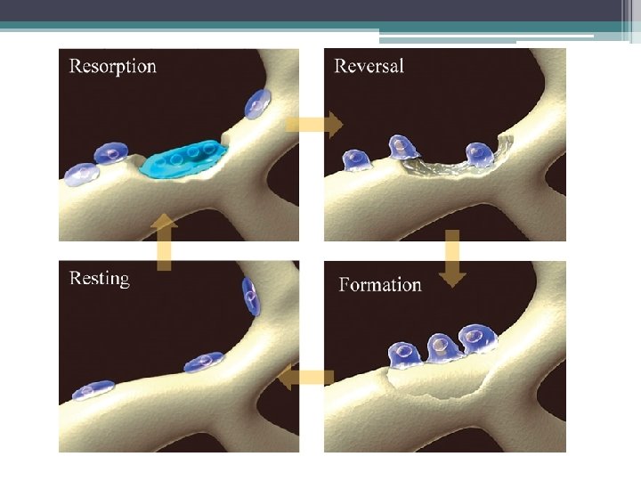 Bone Cells • Osteoblasts: Osteoblasts bone-forming cells • Osteocytes: Osteocytes mature bone cell (doesn’t divide) • Osteoclasts: Osteoclasts dissolve/break down bone (bone resorption) resorption
