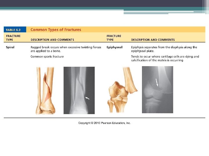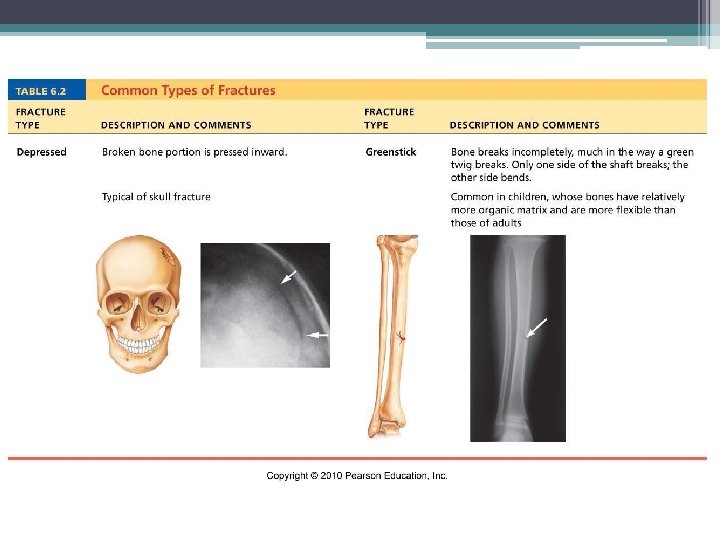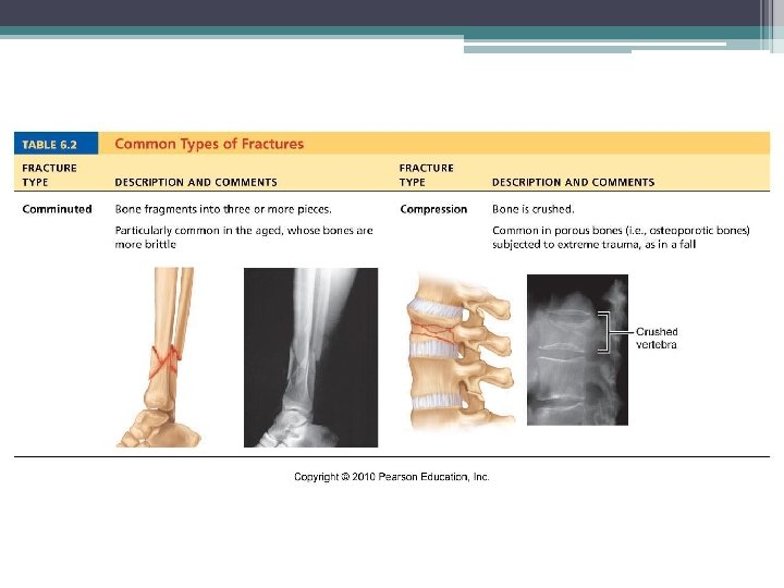Fractures (Breaks) Classified by: 1. Position of bone – nondisplaced (normal) or displaced (bone out of alignment) 2. Completeness of break – complete (broken through) or incomplete 3. Orientation to long axis of bone – linear (parallel to bone) or transverse (perpendicular to bone) 4. If bone penetrates skin – open (compound) fracture or closed (simple) fracture