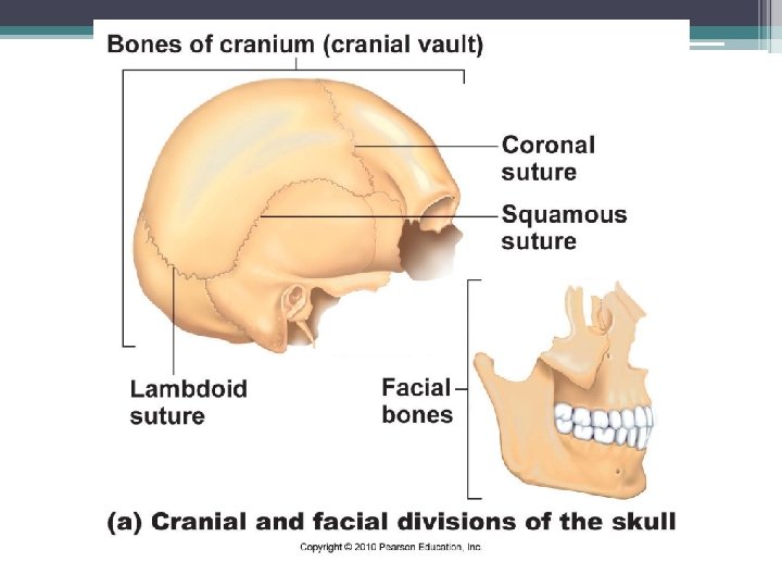 The Skull • 2 bone types: ▫ ▫ Cranial – form the top, sides, and back of the skull Facial – form the face