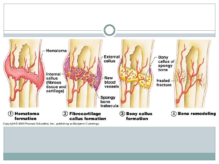 The repair of bone fractures involves four major events: 1. A hematoma is formed. Blood vessels are ruptured when the bone breaks. As a result, a blood-filled swelling called a hematoma occurs. Bone cells deprived of nutrition die. 2. The break is splinted by a fibrocartilage callus. CT cells of various types form a mass of repair tissue called the fibrocartilage callus. • Contains some cartilage matrix, some bony matrix, and collagen fibers. • Acts to “splint” the broken bone, closing the gap.