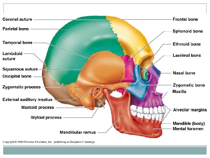 The Skull All but one of the bones of the skull are joined together by sutures. Sutures – Interlocking, immoveable joints. Only the mandible (jawbone) is attached to the rest of the skull by a freely moveable joint.