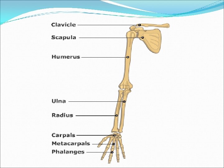 Arm Humerus Long bone located in the upper arm Forearm (2 bones) Radius Lateral long bone in the forearm Ulna Medial long bone in the forearm