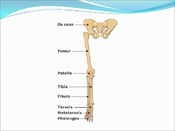 Leg Consists of 4 bones Femur Longest and strongest bone in the body Built for stability, not flexibility Patella Also called knee cap Tibia Long bone on the medial aspect of leg 90% weight bearing Fibula Long bone on the lateral aspect of leg 10% weight bearing