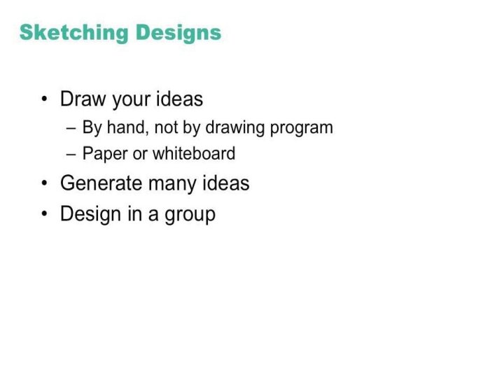 Sketching and Prototyping Early design Brainstorm different representations Choose a representation Sketches & low fidelity paper prototypes Rough out interface style Task centered walkthrough and redesign Medium fidelity prototypes Fine tune interface, screen design Heuristic evaluation and redesign Usability testing and redesign High fidelity prototypes Limited field testing Alpha/Beta tests Working systems Late design