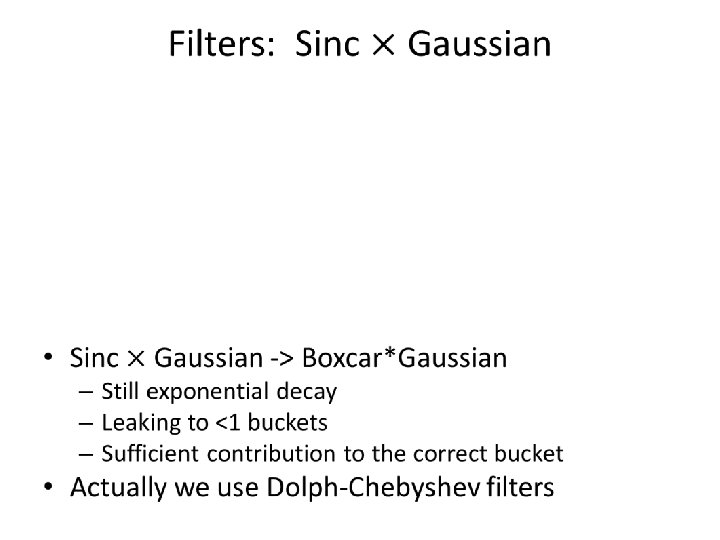 Filters: boxcar filter (used in[GGIMS 02, GMS 05]) • Boxcar -> Sinc – Polynomial decay – Leaking many buckets