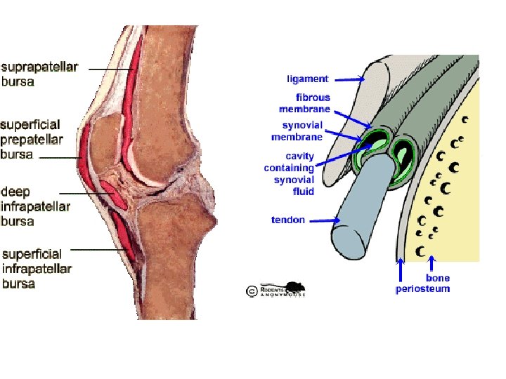 1. Connective: Synovial membranes • Soft areolar tissue • No epithelial cells • Line fibrous capsules surrounding joints (joint is where bones align next to each other) • Line bursae (purse) and tendon sheaths (both cushion organs that move against each other during muscle contractions)