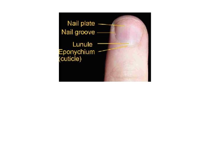 Nails • Like hair dead • Hard keratinized stratified squamous ET found over the dorsal surface of the terminal portions of the digits! Function: To help grasp small objects To prevent trauma to ends of digits To Scratch