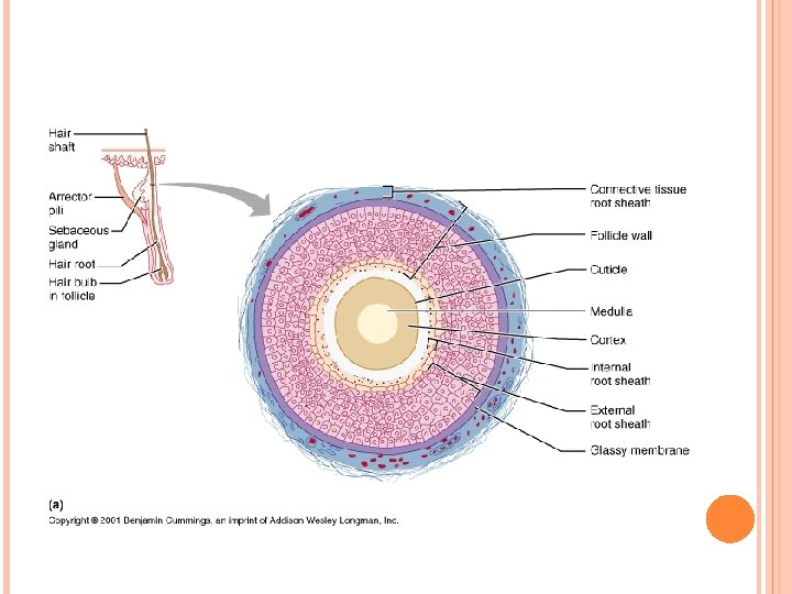 HAIR Hair follicle- shaft, follicle (root) � medulla (inner), cortex (outer), cuticle (cover) Growth- 4 in. /year or 2 mm/week