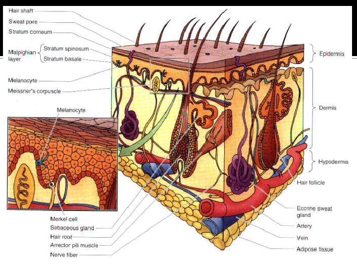 Sweat glands • long tubular glands with deep coiled part. • All over the body except red margins of lips, nail beds, glans penis and clitoris. • The most deeply penetrated structure.