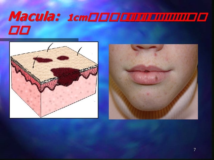 Skin Assessment 1 Skin function n n n Slides: 34 Download presentation Skin Assessment 1 Skin function n n n n Protection/Barrier Sensation Temperature regulation Identification Communication Absorption/Excretion Helps regulate fluid balance Immune Response Function Vitamin D 2 Skin Color : Erythema Pallor Ictere Cyanosis 3 Skin Moisture : Sweating Skin Dryness Skin 4 Turgor : Poor Turgor primary. Lesions 6 Plaque: 11 Wheal ( Urticaria ): ������ 14 Bulla 16 Secondary lesions 19 Hypertrophic Scar 26 Angioma 31 Petechia : <2 mm 32 Purpura: 2 mm-1 cm 33 Ecchymosed: >1 cm 34