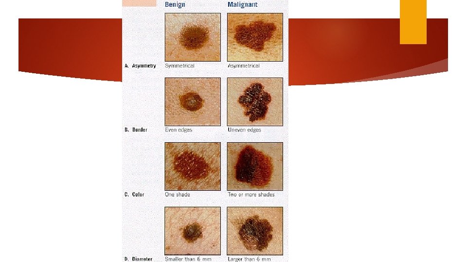 When melanoma develops in a pre existing lesion, there is usually a focal area of color change. It is the distinction in color from the remainder of the lesion, not necessarily the color itself that is the clinical clue. Not one specific color is by itself diagnostic but should raise one's index of suspicion. Slate gray, to black or deep blue indicate melanin pigment deep within the dermis. Pink red may indicate inflammation White may indicate regress or scaring
